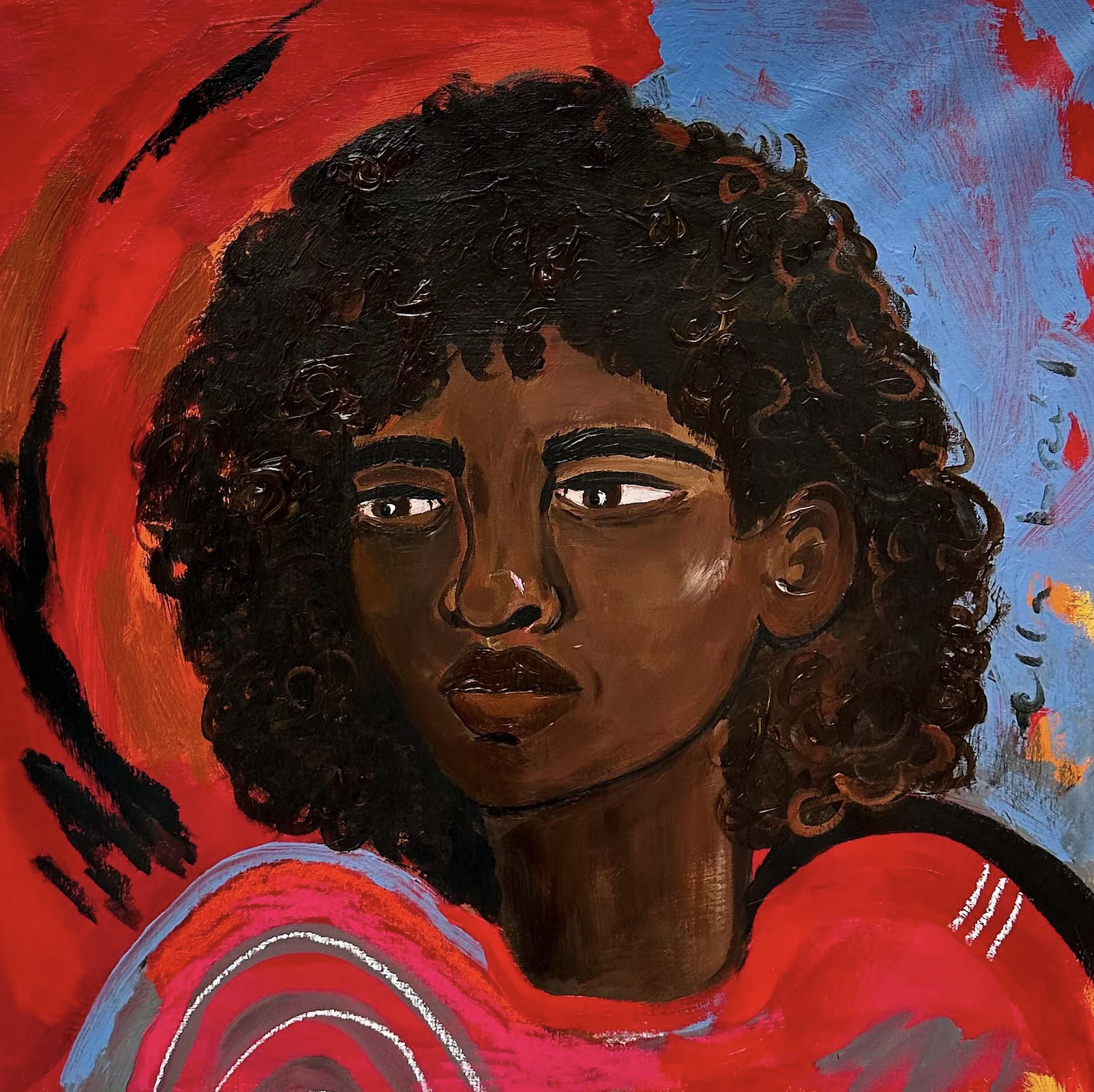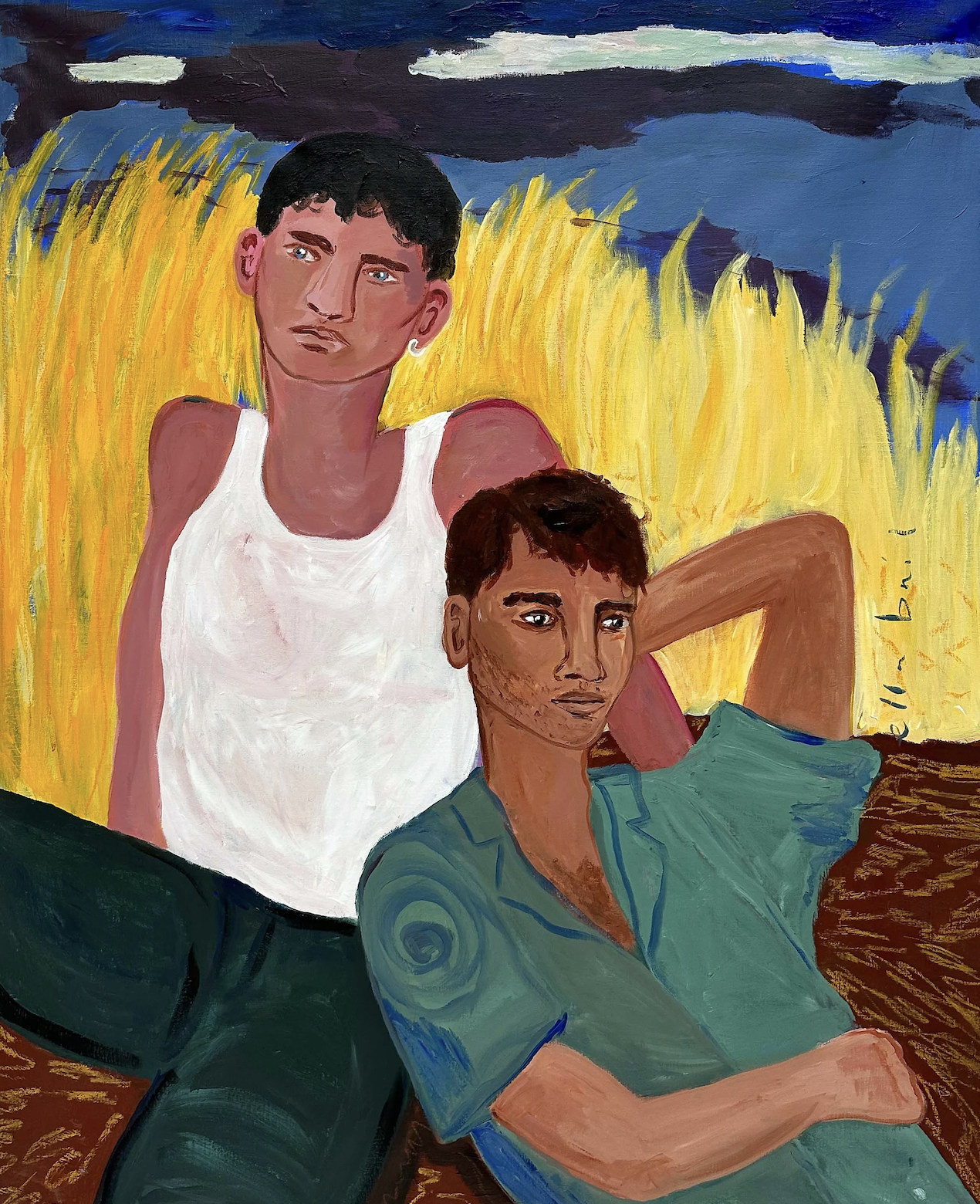 In het universum van Ella Bril (1996°) lopen realiteit en verbeelding in elkaar over. Zoals ze het zelf zegt “ik zie alles in scènes, bijna filmisch” en dat voel je in haar uitgesproken beeldtaal. De rust die haar indrukwekkende schilderijen uitstralen, contrasteren met de onrust die ze zelf ervaart als ze naar buiten kijkt. Ze worstelt met zichzelf en haar weg in het leven. De extreme gevoeligheid van Bril voor de vele prikkels van de buitenwereld vormen de basis van haar kwetsbare werk. Haar doeken lijken decorstukken in een zelfgecreëerd universum. Hoofdzakelijk in olieverf, soms in acryl, schildert ze figuranten die op het eerste zicht zorgeloos in het leven staan. Maar de verstilde personages lijken allemaal in gedachten verzonken, starend, alsof ze dwars door ons heen kijken. Ze zijn er wel, maar ook niet. Ella Bril schildert mensen die ze ziet tijdens haar wandelingen op straat, op café, in het Amsterdam waar ze vandaag woont. In haar atelier brengt ze deze personages tot leven. In uitgesproken kleuren die verwijzen naar het hevige kleurenpalet van de Fauvisten. Het universum van Bril is nog pril, maar als autodidact wordt ze niet gehinderd door techniciteit. Ze werkt op groot formaat en toont haar personages aan de wereld. Zowel alleen, in duo als in groep komen haar generatiegenoten tot leven. Haar decors zijn sober, maar wie goed kijkt ziet details die een verhaal vertellen. De wereld van Ella Bril is een plek waar deze gevoelige kunstenaar zich veilig voelt en waar je als kijker graag op bezoek komt.
